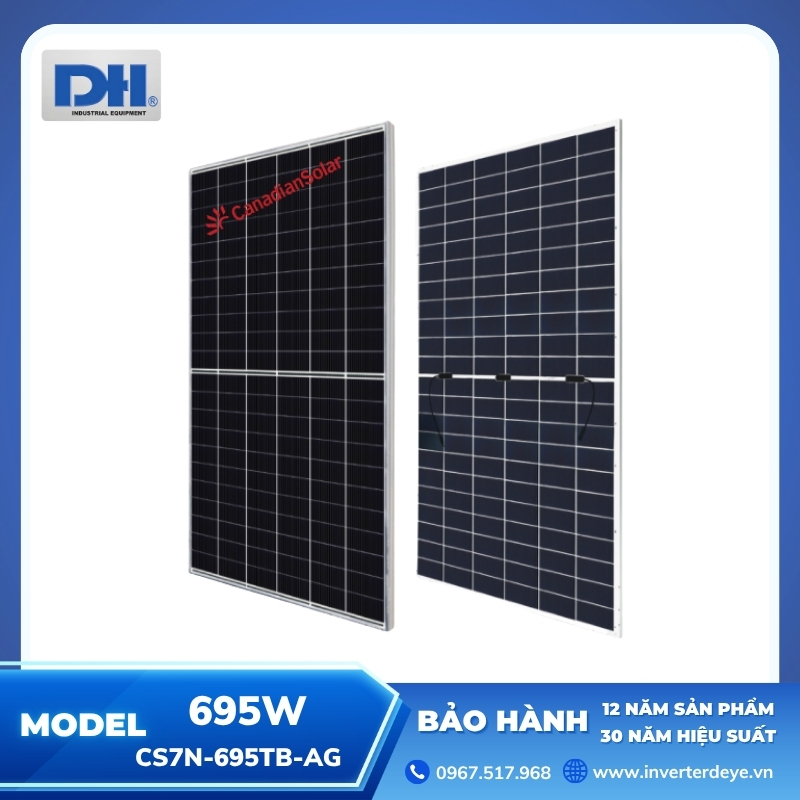 - Tấm Pin Canadian 695W, sử dụng công nghệ N-Type tiên tiến nhất hiện nay. Giúp tăng hiệu suất chuyển đổi năng lượng lên đến 22.4%, cao hơn so với các loại khác trên thị trường.