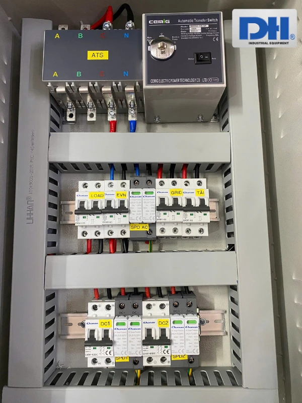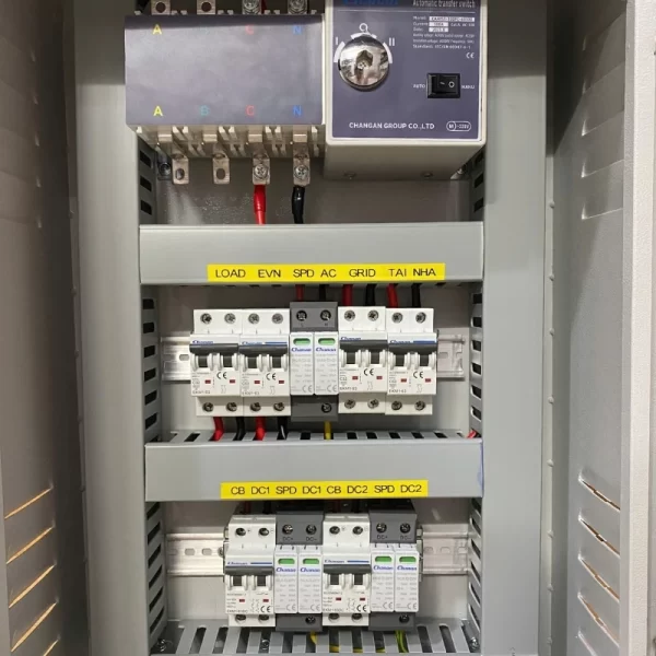 - Tủ điện năng lượng mặt trời được kỹ thuật Solar DH đấu nối sẵn, gọn gàng và đẹp mắt phù hợp với không gian lắp đặt.